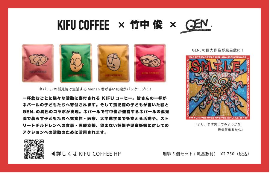 そして孤児院の子どもが書いた絵と GEN. の異色のコラボが実現。ネパールで竹中俊が運営するネパールの孤児 院で暮らす子どもたちへ衣食住・医療、大学進学までを支える活動や、スト リートチルドレンへの食事・医療支援、望まない妊娠や児童妊娠に対しての アクションへの活動のために活用されます。